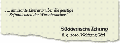Die erste psychologische Studie zum Oktoberfest. Die sozialpsychologische Struktur des Oktoberfestes wird auf der Grundlage zahlreicher Interviews von Besuchern und Beschäfigten auf der Wiesn untersucht und in die Kapitel Masse, Event, Sucht, Rausch und Ritual unterteilt. Die Autorin greift in ihrer Analyse dieses schon "institutionsgleichen" Festes bis auf Platon, Aristoteles, Elias Canetti, Norbert Elias, Nietzsche, Freud und die Ritualtheoretiker Van Gennep und Victor Turner zurück. Intelligent, leicht lesbar und oft mit einem Augenzwinkern geschrieben werden die rauschhaft-euphorischen Begebenheiten der Wiesn mit dionysischen Kulten aus dem antiken Athen und der rituellen Communitas nach Turner verglichen. Die Betrachtung des Oktoberfestes als pseudo-sakrales Ritual, also als Kommunion der Massen im Bierzelt mit den Eigenschaften eines archaisch-ekstatisch anmutenden Kultes eröffnet einen außergewöhnlichen philosophischen Blick auf das größte Volksfest der Welt.